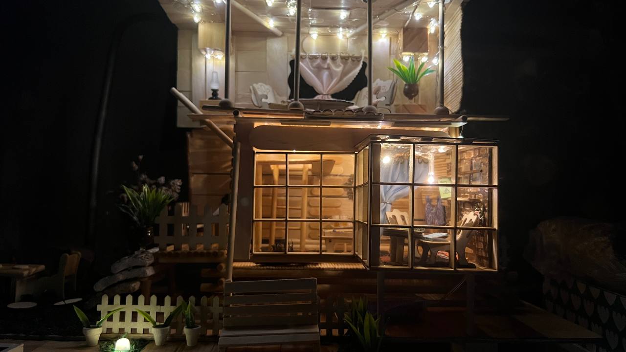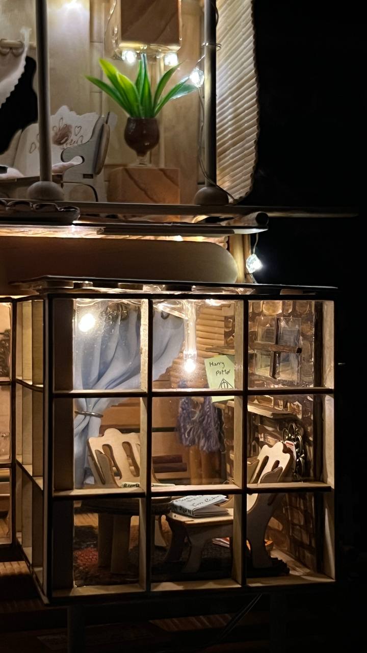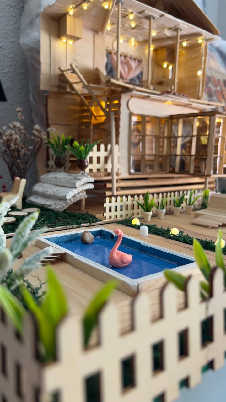 At first, it wasn’t planned at all. I had absolutely no intention of building this cabin. I started by making a simple platform on a few small supports. Then I felt like adding a wall to it. I missed the tiny scale models I had left behind in Iran. I went to a shop, saw some small miniature models, and bought them. And I thought: I should put a roof on top of these walls, and under it a few chairs, a table, and some books. Little by little, a yard took shape. A window was added. Curtains. A sofa and a painting. Little by little, grass appeared. Little by little. And little by little, my cabin formed all by itself. I couldn’t believe how it was coming together. While I was building this cabin, I was listening to Rich Dad by Robert Kiyosaki. I was thinking that I want to be a “rich mom” for my children too, and create a worry-free life for them. After completing some stages, I would stop and think and say to myself: I wish I had made some parts this way or that way instead. But even that felt good. Because I didn’t know what was going to happen next. There was no model to follow. Everything was completely intuitive and spontaneous. Just like life. I kept going, with pleasure, and I’m still continuing. Arezoo M.Fard
